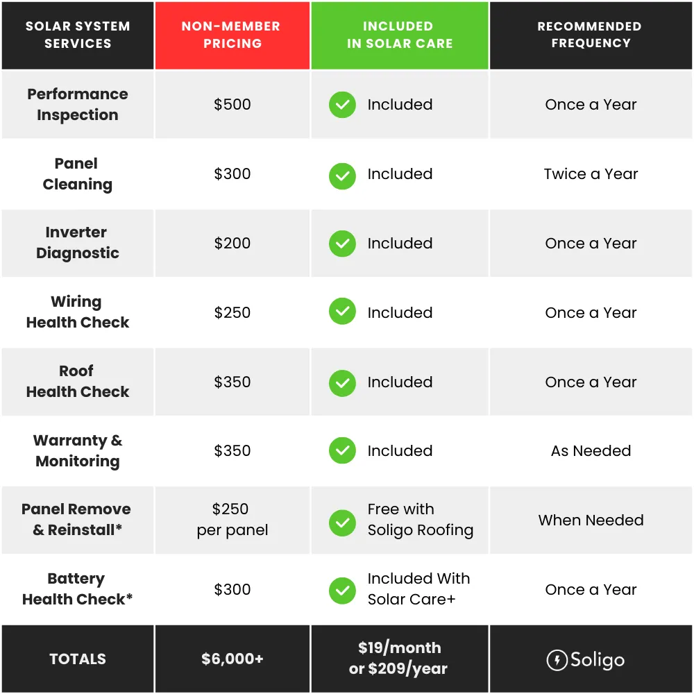 Yes. Solar Care+ includes an electrical panel check — breakers, grounding, corrosion, and labeling — to ensure your system is safe and code-compliant.
